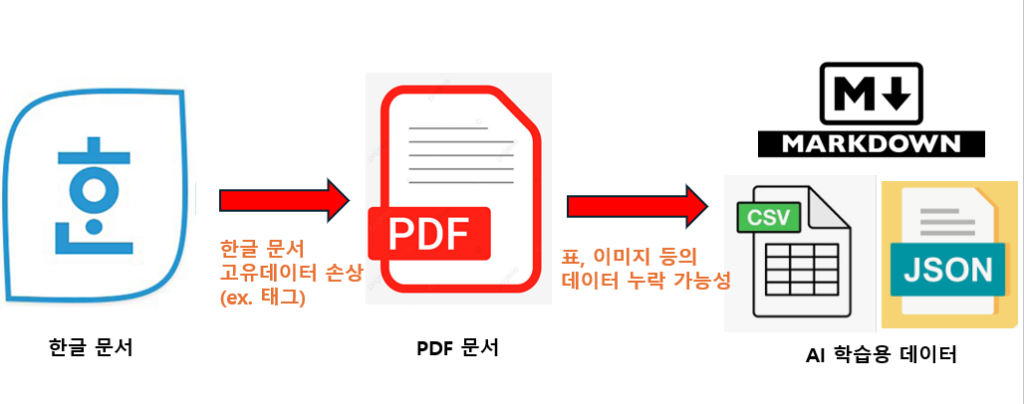 - 한글 문서를 PDF를 걸쳐 AI 학습용 데이터로 변환하는 과정에서 태그 같은 한글 문서의 고유 데이터가 손상됩니다. 또한, 데이터로서 PDF는 구조적인 정보를 포함할 수 없습니다. 그래서 PDF를 AI 학습용 데이터로 변환 시 표, 개체, 이미지 등이 누락되거나, 표의 구조가 완전히 깨져 텍스트가 뒤섞이는 등 원본 데이터가 심각하게 훼손될 수 있습니다.