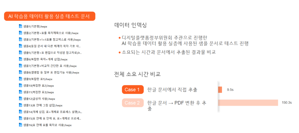 - HWPX에서 직접 데이터를 추출하는 것(Case 1)에 비해, PDF로 변환한 후 추출하는 것(Case 2)은 테스트 결과 약 15.8배 더 많은 시간이 소요되었습니다 (직접 추출 9.5초 vs PDF 변환 후 추출 150.3초).