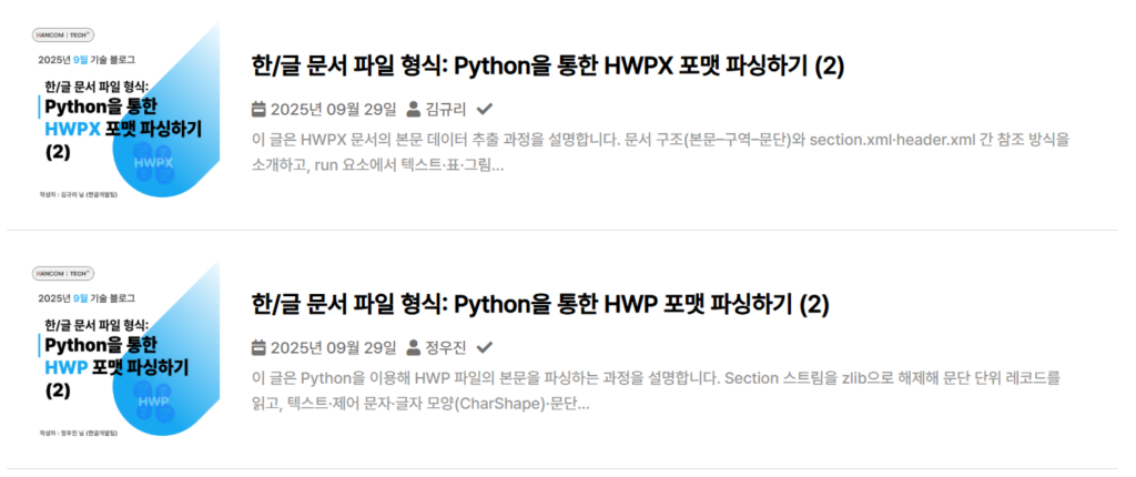 한컴은 기술 블로그와 개발자 포럼을 운영하며 HWP/HWPX 관련 기술 노하우를 공유하고 개발자 문의에 직접 대응하고 있습니다. 또한 공식 라이브러리를 사용하지 않고도, Python 예시 코드만으로 한글문서에서 데이터를 손쉽게 추출하는 방법을 안내하고 있습니다.