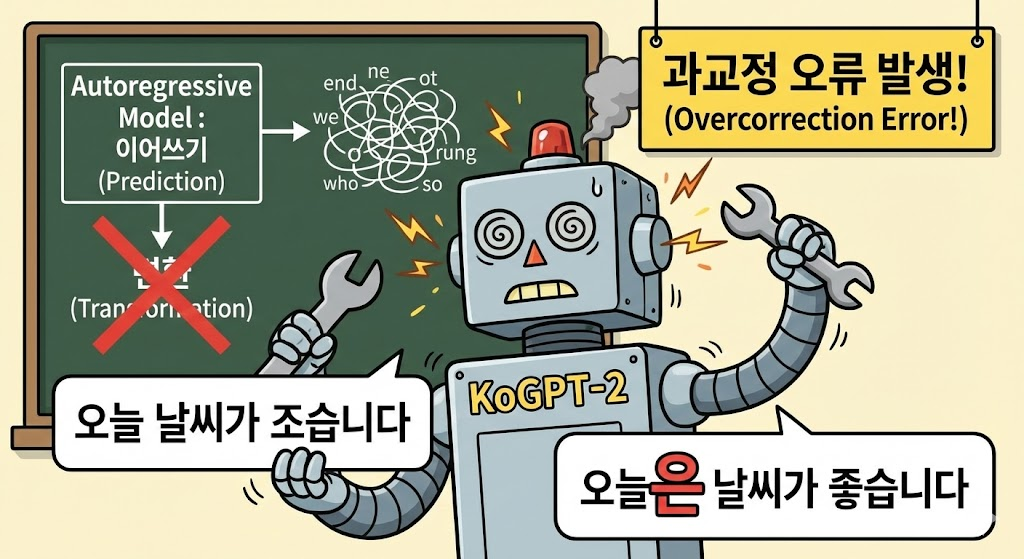 그러나 맞춤법 교정은 다릅니다. 입력 문장을 이해하고, 오류 부분만 정확히 수정한 문장을 출력해야 합니다. “이어쓰기”가 아니라 “변환”에 가깝습니다.
