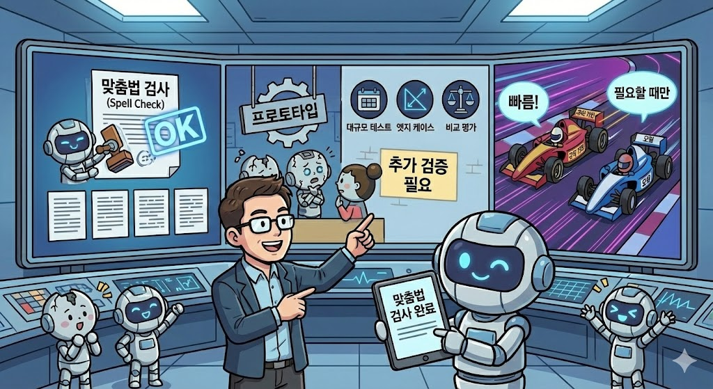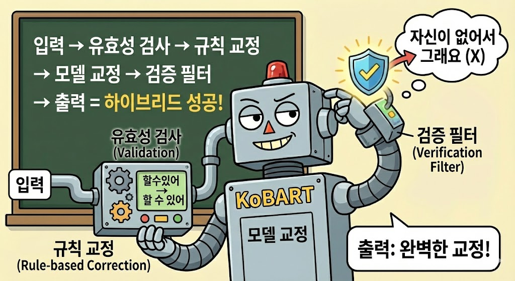 명확한 오류는 규칙으로 빠르게 잡고, 복잡한 문맥은 AI가 처리합니다. 그리고 AI가 과하게 고치려 하면, 필터가 막습니다.
