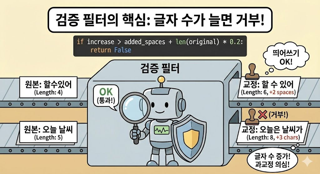 “글자 수가 늘면 거부”라는 단순한 규칙으로 과교정의 대부분을 필터링할 수 있었습니다.