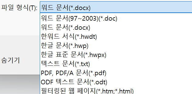 파일 형식 드롭다운을 내려 살펴보면, .doc 옆에 (97~2003)이라는 숫자가 붙어있는 것을 볼 수 있습니다. 아래에서 다시 설명하겠지만, 이는 DOC가 1997년부터 2003년 사이에 사용된 과거의 포맷임을 의미합니다.