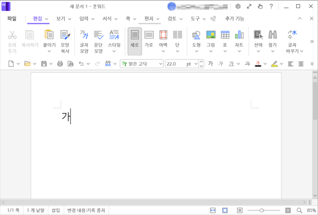 예를 들어 ‘가’라는 문자 하나가 있는 문서가 있다고 가정해 봅시다.