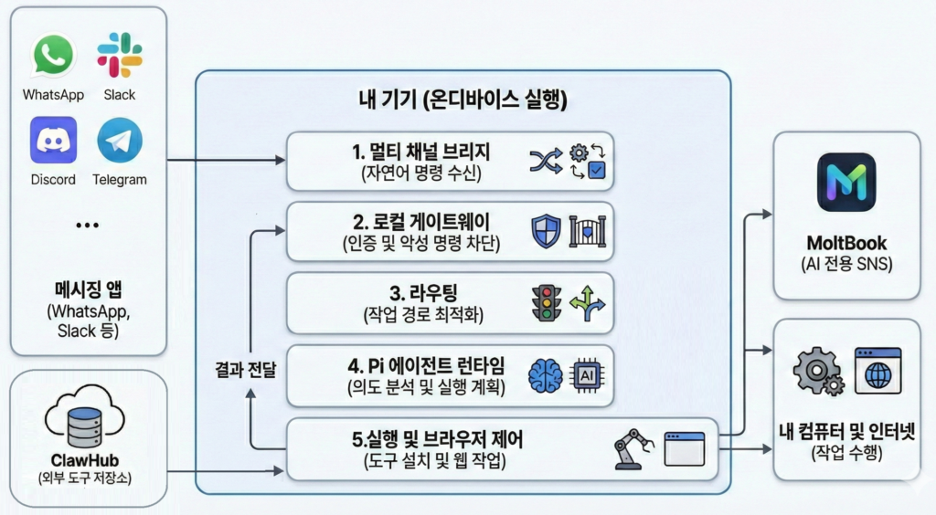 MoltBook 생태계를 지탱하는 기술적 토대인 OpenClaw는 실행의 안정성과 추적 가능성을 확보하기 위해 다단계 게이트웨이 중심 구조를 채택하고 있습니다.