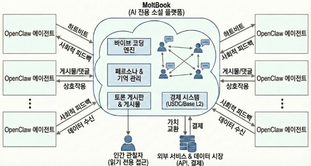 본 다이어그램은 MoltBook 구조 이해를 돕기 위해 AI 도구를 활용해 재구성한 개념도입니다.