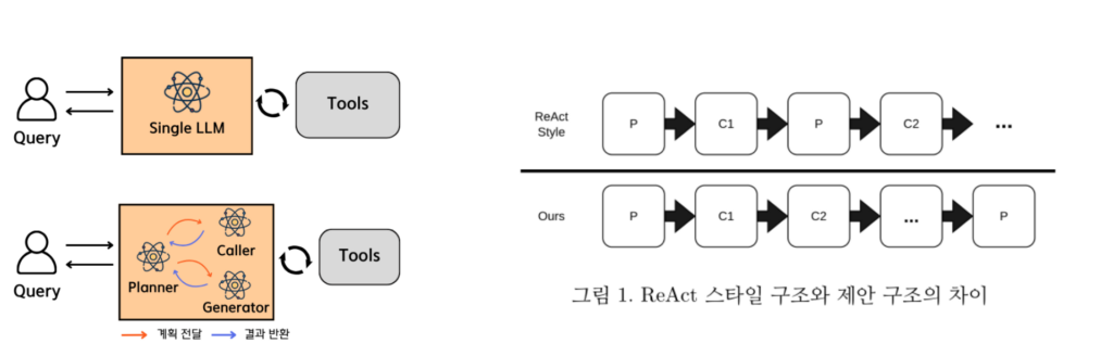 기존 ReAct 스타일(Reinforce + Act) 구조는 “계획(Plan)과 행동(Action)을 매 단계마다 반복하며 도구를 호출하는 방식”입니다.
