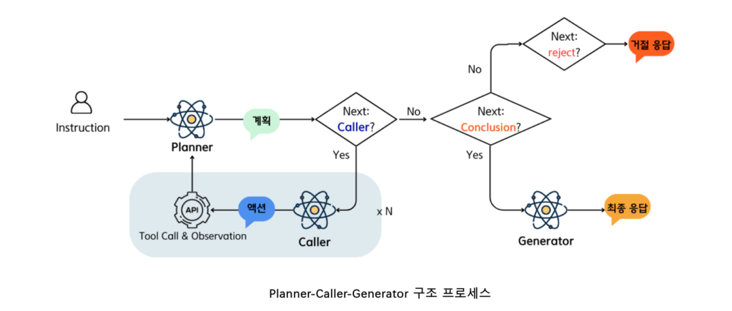 | Caller | 도구 호출 및 인자 검증 | Planner의 계획을 실행하고 결과를 수집 |